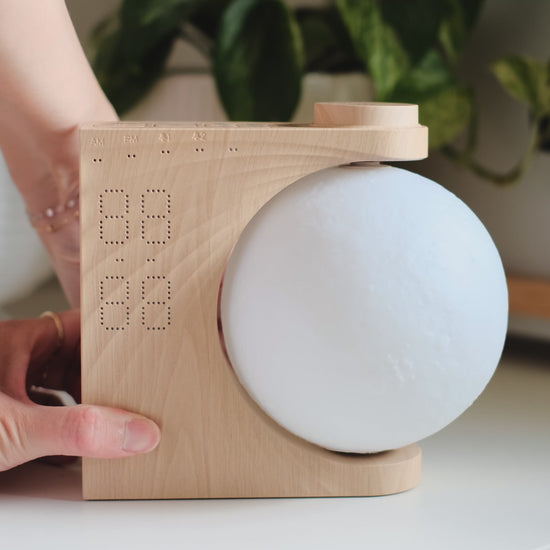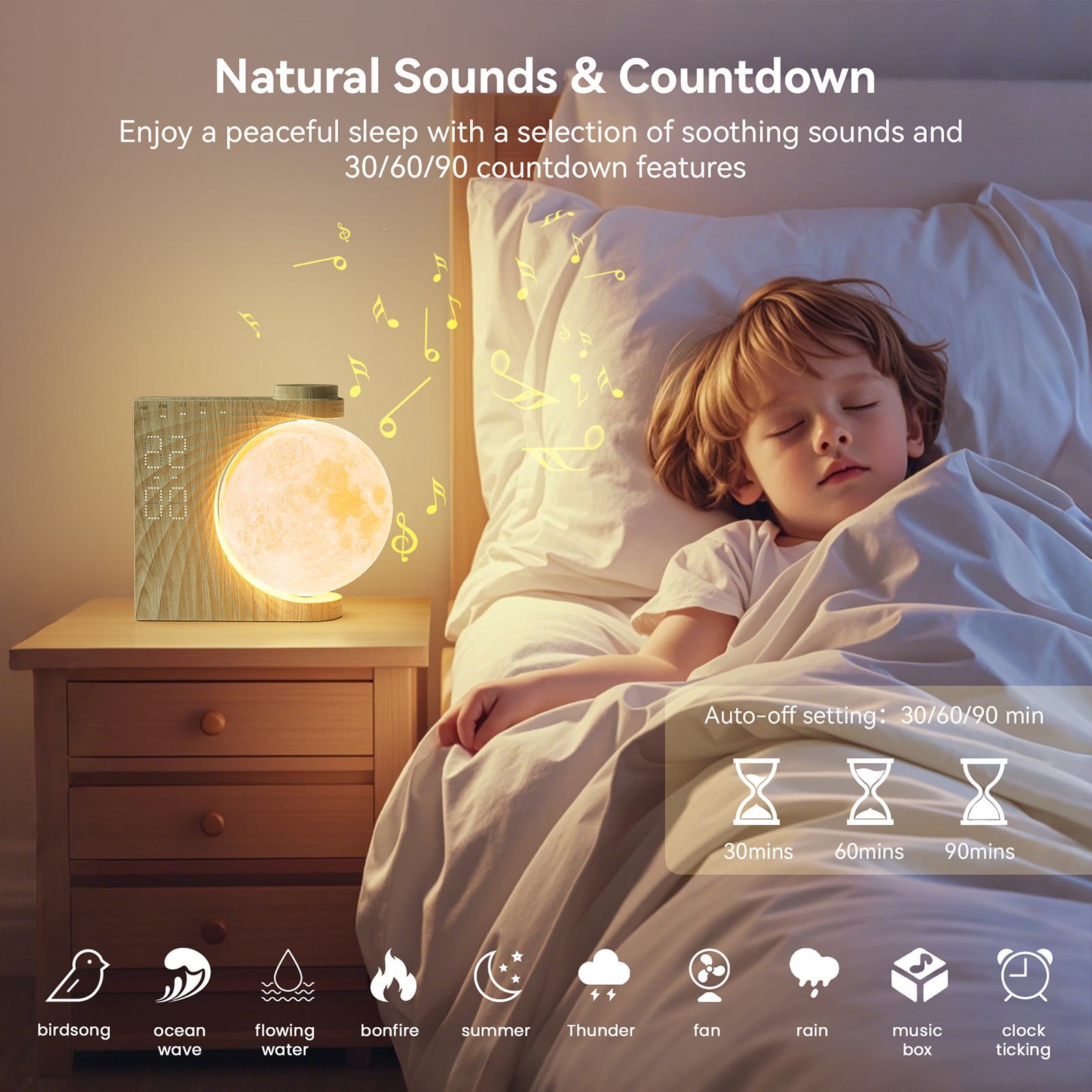 - Rotatable Multifunction Moon Light Clock:After the alarm goes on,short press the snooze button position to snooze for 10 minutes, long press to cancel the day's alarm, in addition, the snooze button position can also be adjusted to adjust the brightness of the time display.The bedside lamp has 2 sets of alarm settings with a choice of 15 alarm tones and 10 soothing nature sounds,30/60/90 minute countdown timer,10 color effects,3 adjustable brightness levels and 1 breathing light. (Note: lt is normal for the motor to make a slight noise.Briefly press the