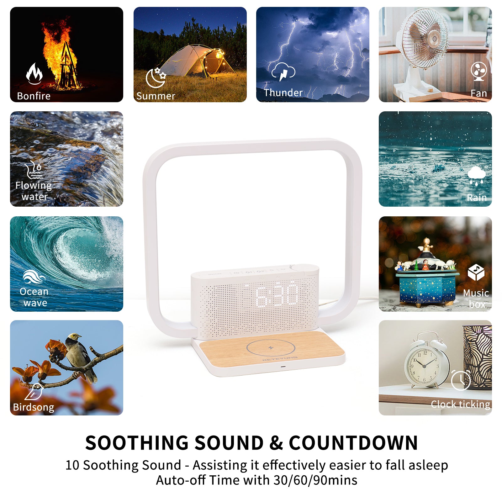 - Sunlight Alarm Clock Function: After the alarm goes on,short press the snooze button position to snooze for 10 minutes, long press to cancel the day's alarm, in addition,the snooze button position can also be adjusted to adjust the brightness of the time display. The bedside lamp has 2 sets of alarm settings with a choice of 15 alarm tones and 10 soothing nature sounds. 30/60/90 minute countdown timer